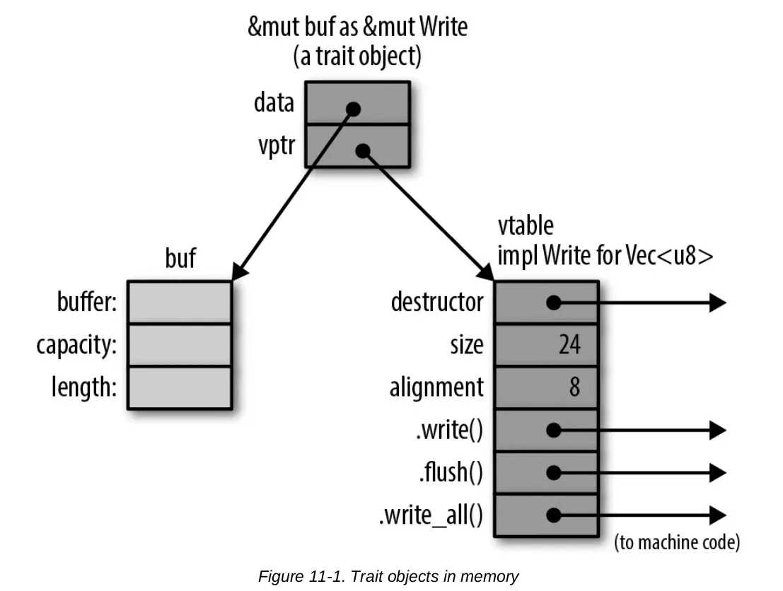 在上面的例子中变量v明明实现了Write trait,却没办法进行引用。编译器给出的错误提示是:变量i在编译时大小未知。如果改为let i: &dyn Write = &mut v; ,则编译正常。其中&Write就是一个trait object,它在编译期能确定大小。下面看一下它在内存中的样子: