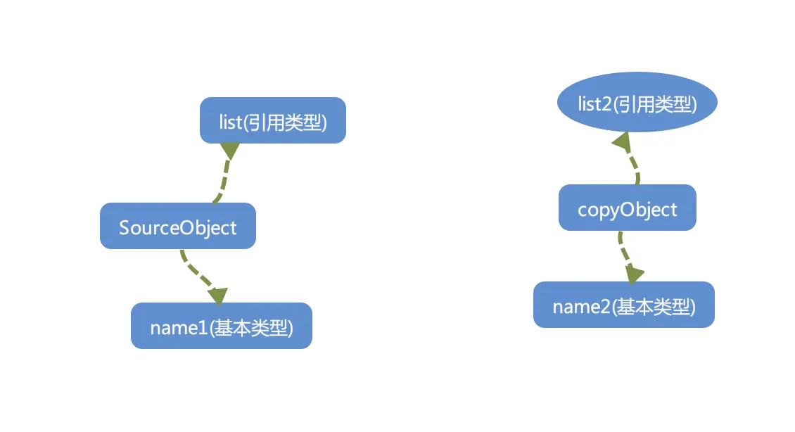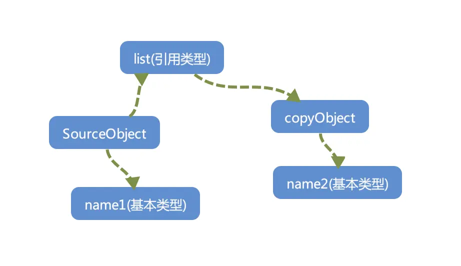 上图 SourceObject是原始对象,有基本类型name1和list引用类型。浅拷贝之后name1和name2是不同属性,互不影响。list是同一个对象,改变之后会影响另一个对象