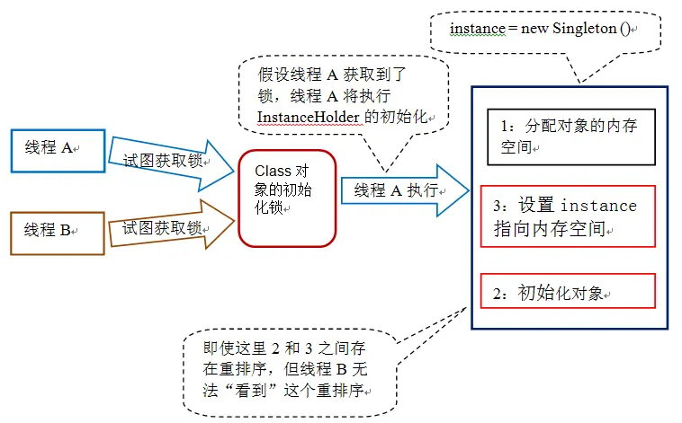 由于 java 语言是多线程的,多个线程可能在同一时间尝试去初始化同一个类或接口(比如这里多个线程可能在同一时刻调用 getInstance() 来初始化 InstanceHolder 类)。因此在 java 中初始化一个类或者接口时,需要做细致的同步处理。