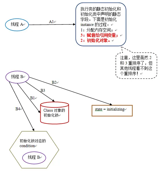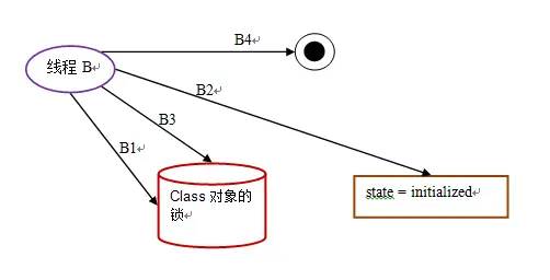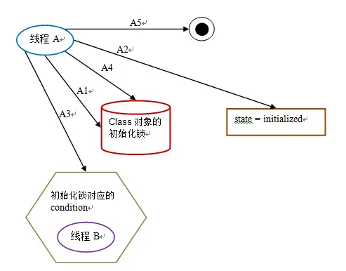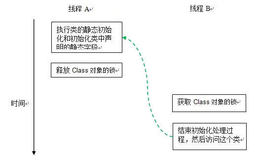 假设 Class 对象当前还没有被初始化(初始化状态 state 此时被标记为 state = noInitialization),且有两个线程 A 和 B 试图同时初始化这个 Class 对象。下面是对应的示意图: