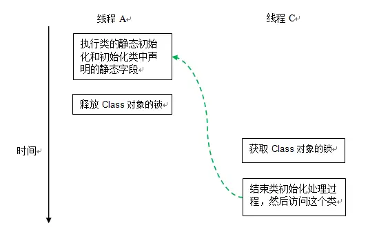 在第三阶段之后,类已经完成了初始化。因此线程 C 在第五阶段的类初始化处理过程相对简单一些(前面的线程 A 和 B 的类初始化处理过程都经历了两次锁获取 - 锁释放,而线程 C 的类初始化处理只需要经历一次锁获取 - 锁释放)。