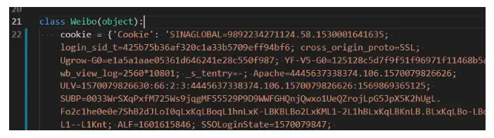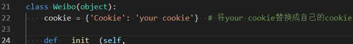 然后替换大约在weibospider.py文件的22行左右的cookie,如图所示:
