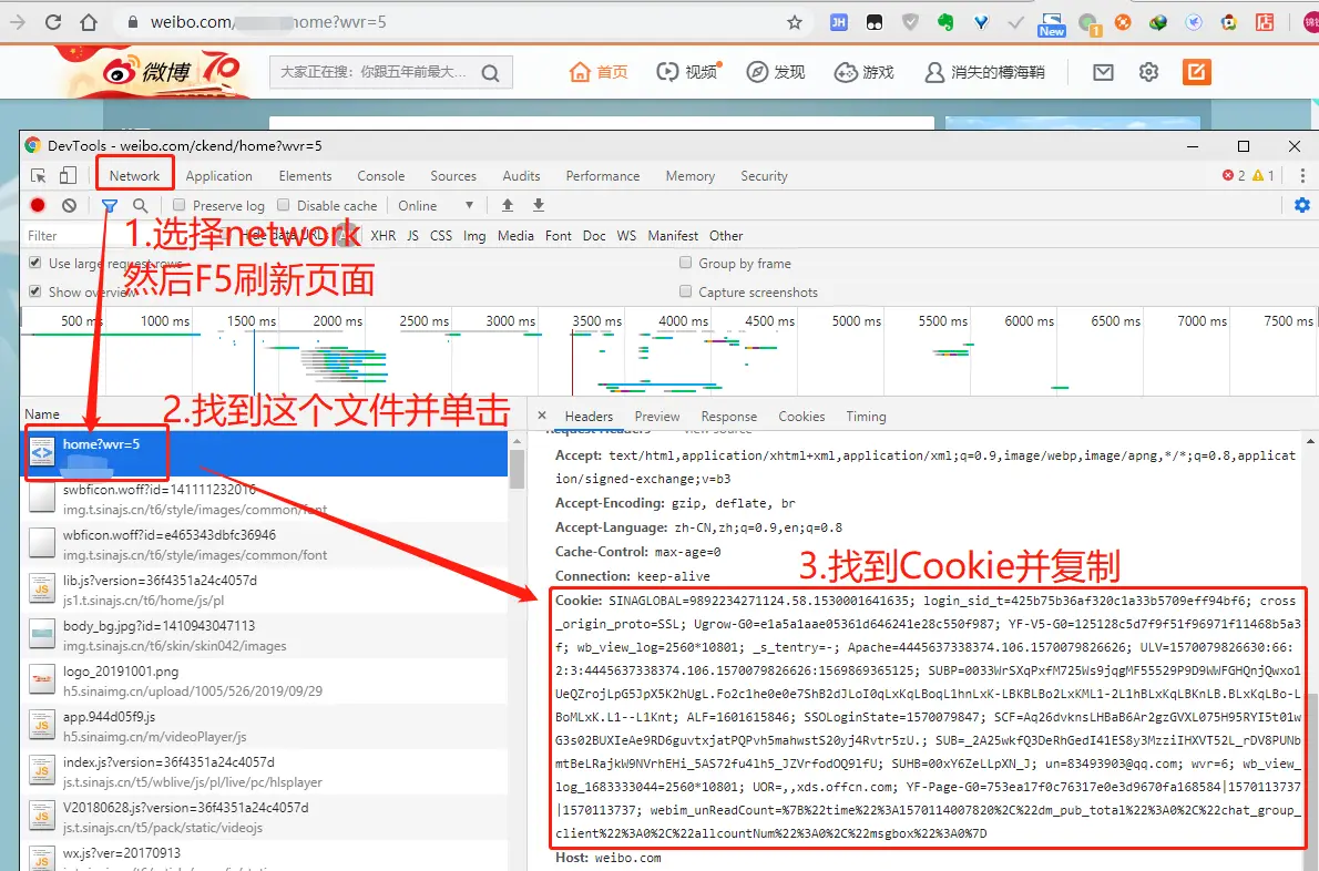 打开weibospider文件夹下的weibospider.py文件,将"your cookie"替换成爬虫微博的cookie,具体替换位置大约在weibospider.py文件的22行左右。cookie获取方法: