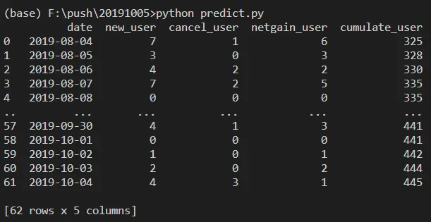 看得出来dataframe有点像字典和列表的集合,接下来就要开始进行预测了!