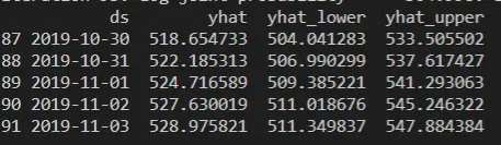 print(forecast[['ds', 'yhat', 'yhat_lower', 'yhat_upper']].tail())
