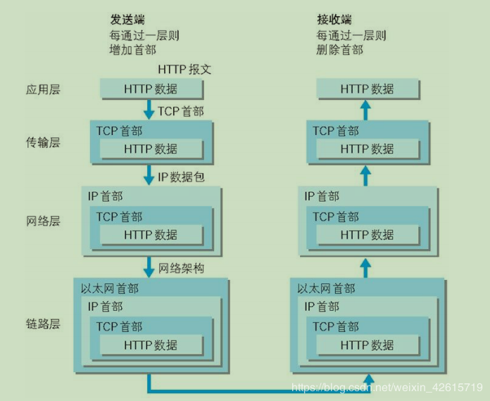 TCP / IP协议进行网络通信时, 客户端(发送端) 会从应用层 往下走, 一层 一层的传输, 每进入一层,被被打上标记序号以及端口号, 当客户端 走完 自己的 4 层时, 会进入 服务端(接收端) ,它是按 链路层 然后 一层一层 往上走, 每进入一层, 取消一个 标记序号, 直到顶层(应用层),这时, 服务端才接收到了客户端向服务端发送的请求。
