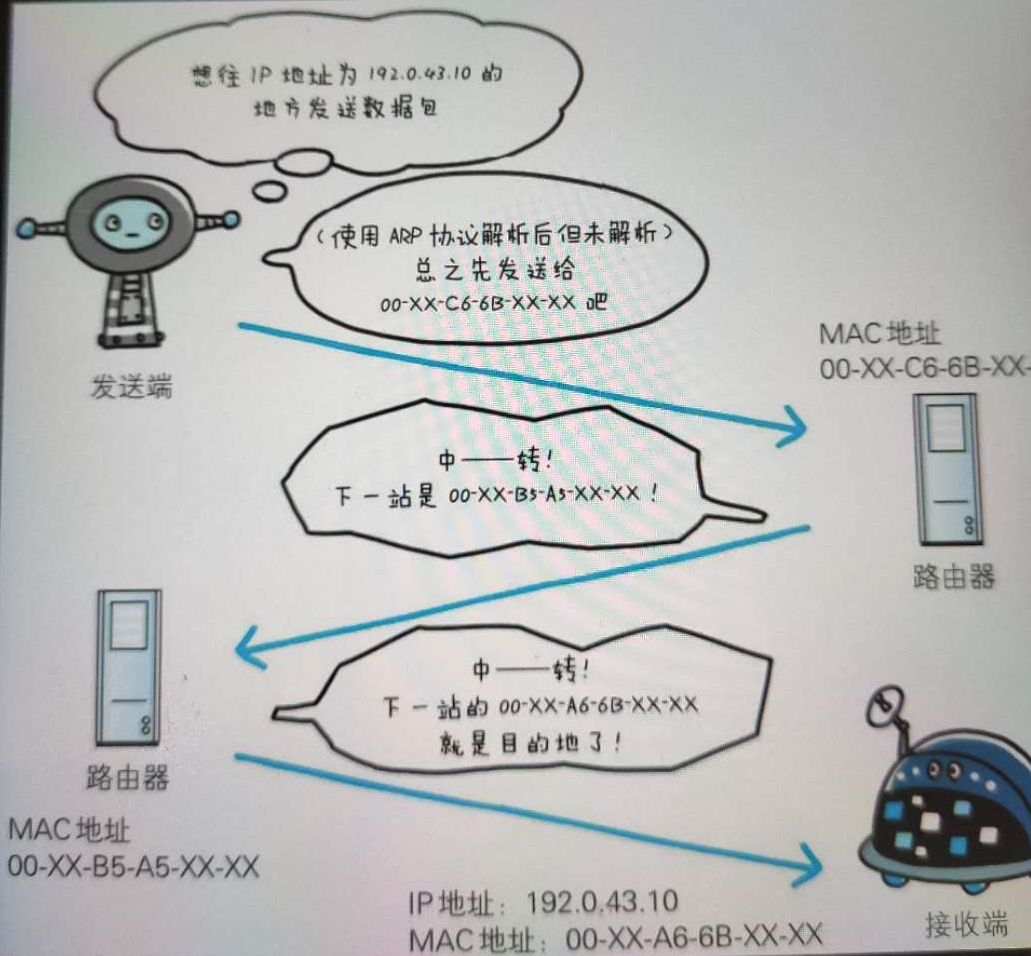 计算机于计算机之间通信时,它不会直接查找到对方IP的,中间过程会经历 设备中转,在进行中转的同时,它 会 采用 ARP 协议 来 推出 IP 地址的 MAC 地址,经过多次中转最终找到对方的 MAC 地址, MAC 地址 于 IP 地址匹配, 成功的建立了连接。
