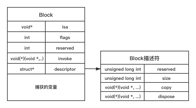 - invoke:函数指针,指向的是实际的功能运行函数。在invoke函数的参数中还包含了Block结构体本身,这么做的目的是在执行时,可以从内存中获取block中捕获的变量。