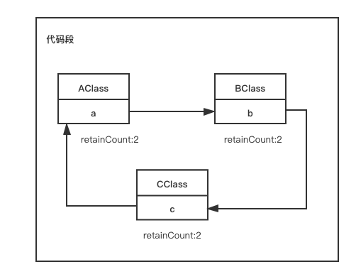 当A类对象强引用了B类对象,B类对象强引用了C类对象,而C对象又强引用了A类对象。假设它们都在一个代码段中。如下图所示: