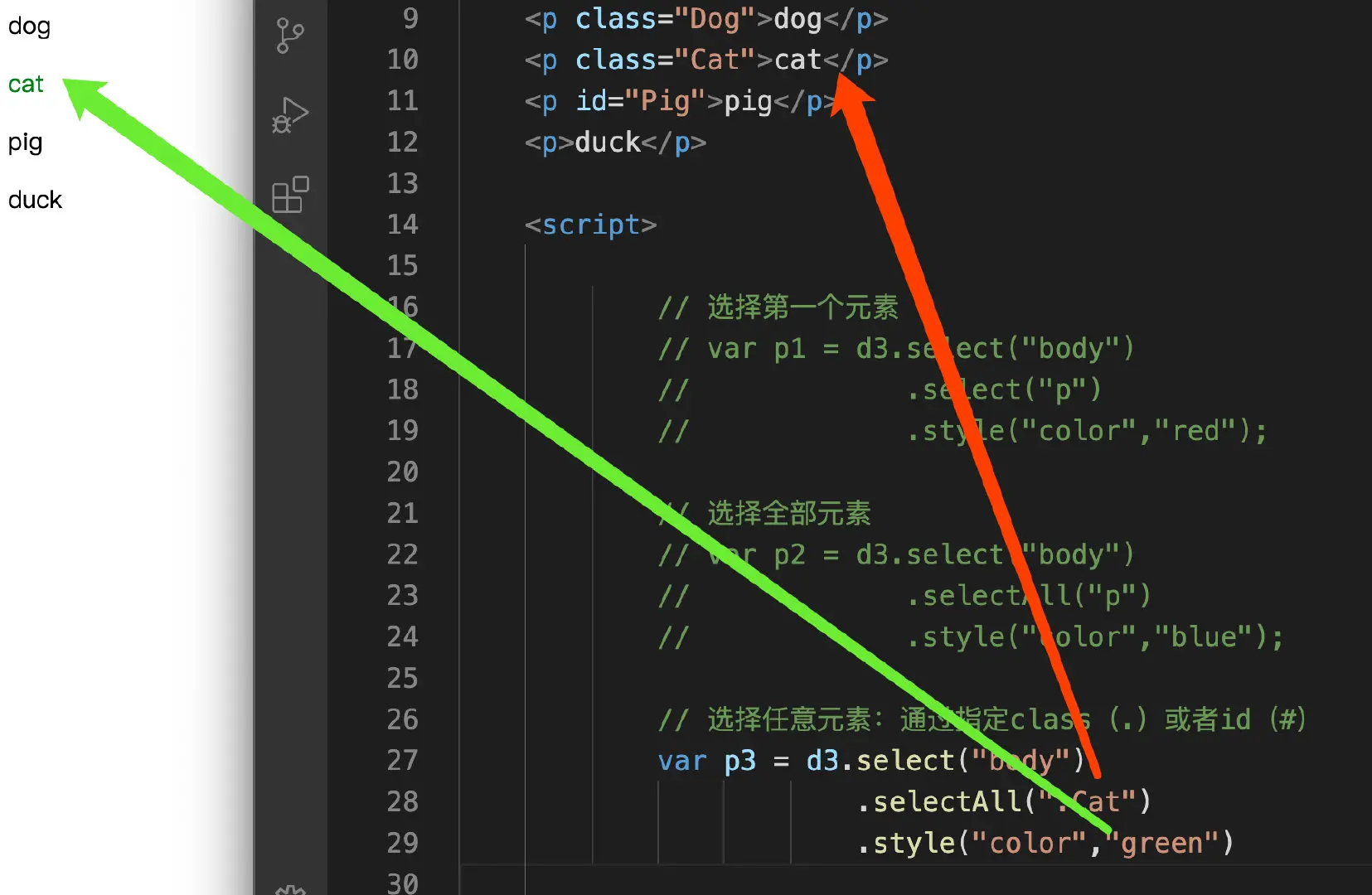 在之前的文章D3.js库-2-选择元素和绑定数据中,有介绍过D3.js中的两种选择数据的方法,本部分为重复内容,温故而知新: