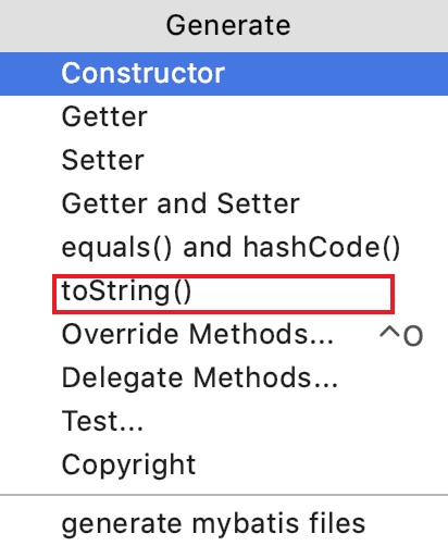1.1 接下来我们覆盖重写一下toString方法(mac版idea command+n)呼出下拉框