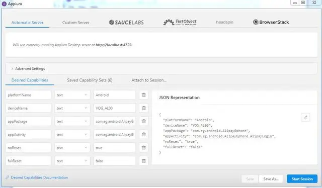 配置好4个参数,第一个参数是手机操作系统,第二个参数是手机型号,在设置中可以找到,第三、四参数是app的两个特定值,点击start session就可以操控手机了。