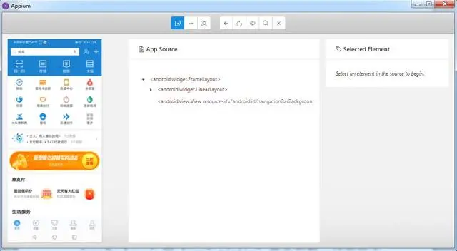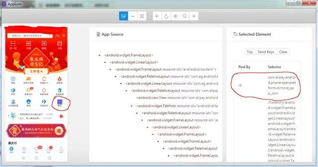 只需用客户端appium打开手机APP,然后将鼠标放在需要点击的部位,在右侧就能找到该部位的元素了。然后依次点击下图按钮: