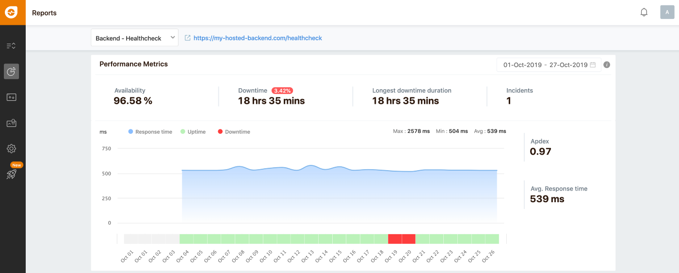 在这篇教程中,我将使用Freshping去监控托管API的运行情况。以下报告显示了2019年10月的数据。