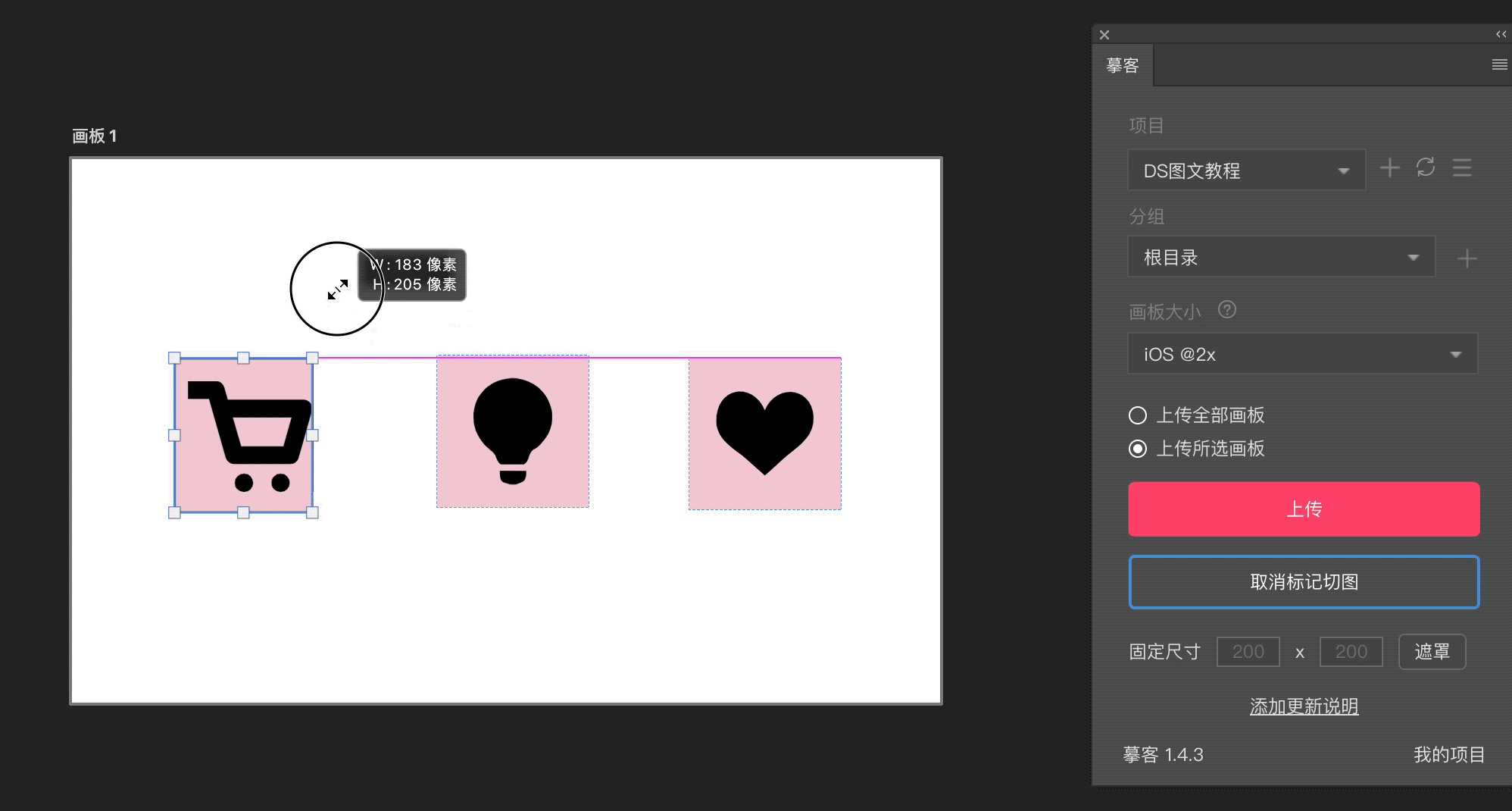 面对如此多的不规则图标,设计师要花费大量的时间,把图标切成统一尺寸的切图。使用摹客 PS 插件中的“固定尺寸”功能,在插件上填写你所需切图尺寸的数值,摹客会自动给图片添加一个遮罩!上传到摹客平台后,识别到的便是同遮罩大小的切图,元素的背景区域将会是透明的。