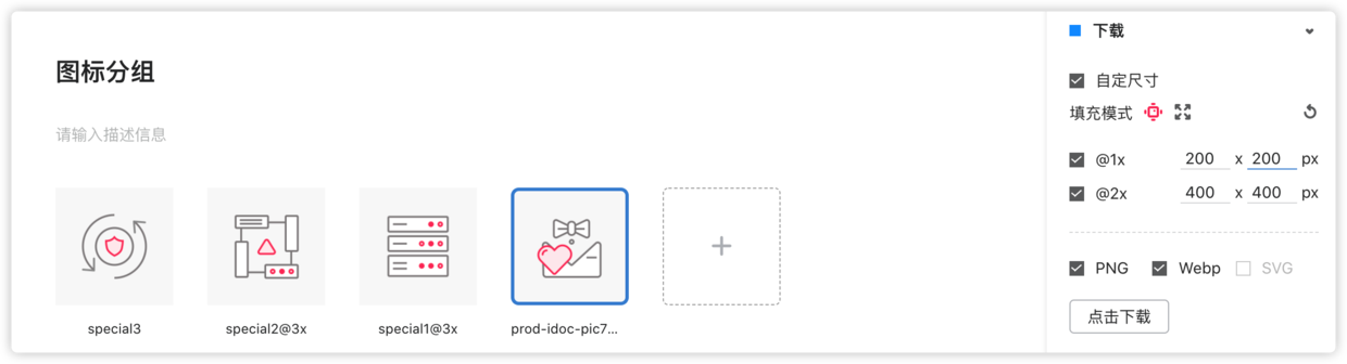 现在在摹客设计规范里,可以对资源库中的图标,自定义切图尺寸。填写某一行数值后,其它倍率的数值自动生成,还可以选择PNG/WebP/SVG的格式,一键将切图下载到本地~