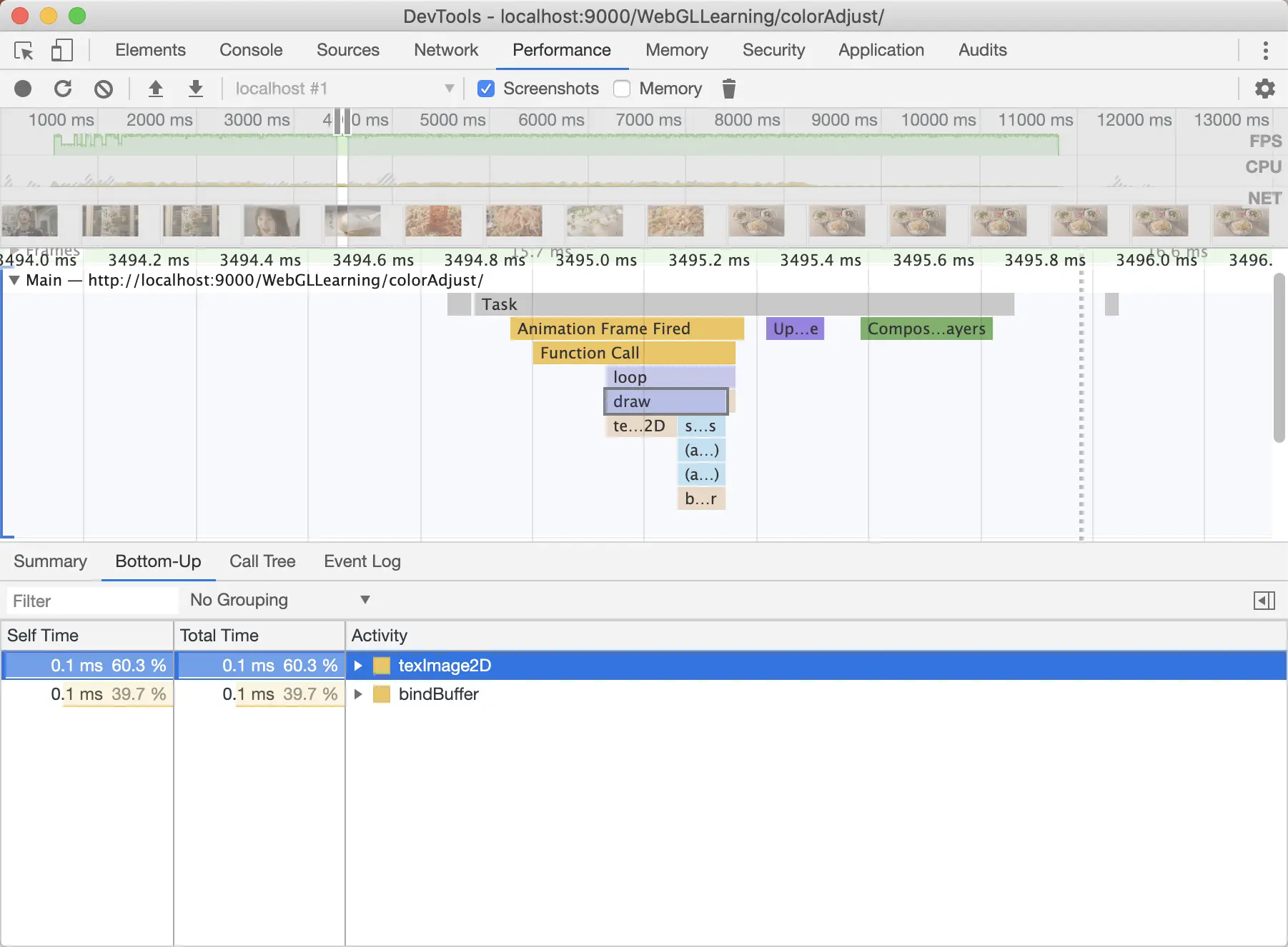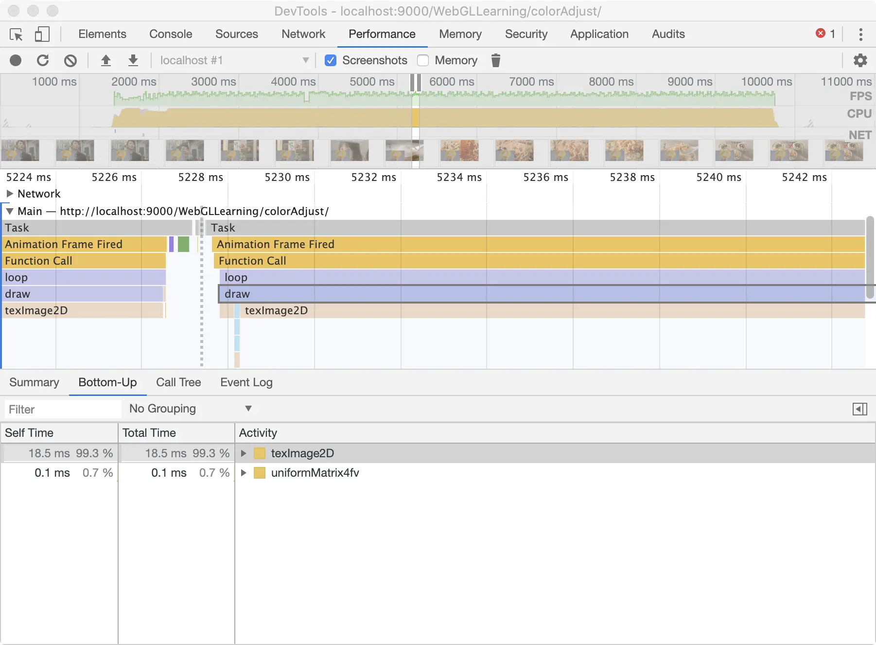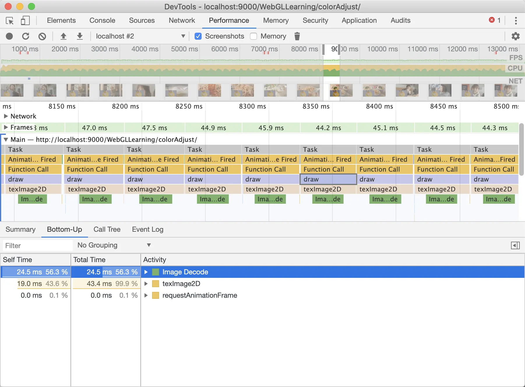 通过上图我们可以很清晰的看到,在一帧中,我们只调用了draw这个函数,在这个函数中花费时间最多的就是texImage2D这个函数了。为什么只渲染视频的时候texImage2D只需要0.1ms,这里却需要这么久? 我们仔细观察发现,再渲染有图片的情况时,texImage2D中还多了一个函数Image Decode,这又是干什么用的呢? 顾名思义,这就是将图片格式解码为裸RGBA数据。而且图片越大越清晰,花费的时间也就越多。 那么,如果我们传入GPU中的就是解码好的RGBA数据,效果会不会好很多呢?
