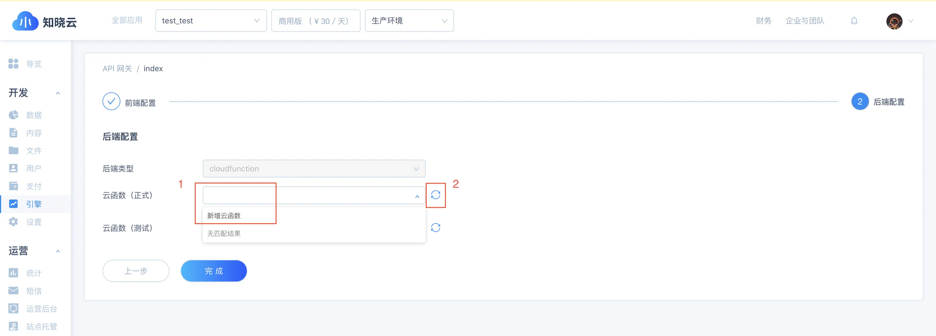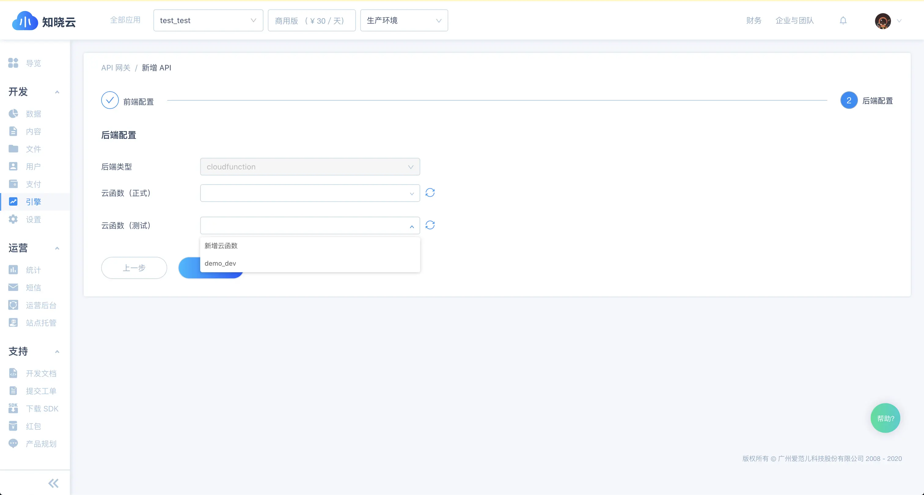 完成前端配置后,再进行后端云函数的配置,给正式/测试环境配置相对应的云函数。