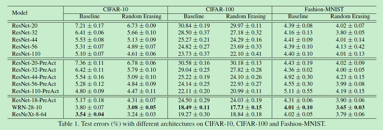 [1] Zhong Z, Zheng L, Kang G, et al. Random erasing data augmentation[J]. arXiv preprint arXiv:1708.04896, 2017.