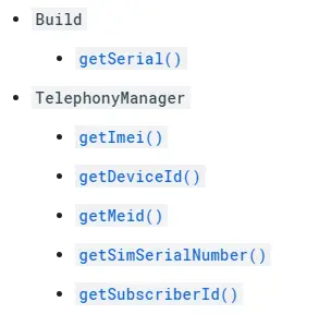 从Android10开始,应用必须具有READ_PRIVILEGED_PHONE_STATE权限才能访问设备的唯一标识符(包含IMEI和序列号),该权限只提供给系统应用,所以一般应用无法访问硬件标识符。以下是受影响的方法: