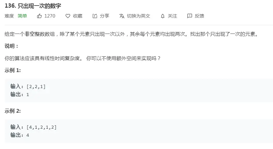 如果没有题目要求的算法具有线性时间复杂度,和不能使用额外的空间实现,这道题很好解,直接暴力搜索时间复杂度为O(n^2),就可以完成。但想了很久都没有想到满足题目要求的解法,于是参考了官方的题解。官方题解