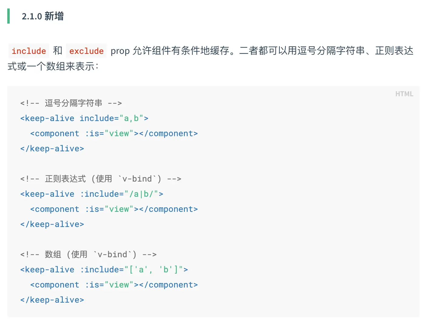 include- 字符串或正则表达式。只有名称匹配的组件会被缓存。exclude- 字符串或正则表达式。任何名称匹配的组件都不会被缓存。