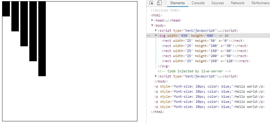 五个数据渲染出来了相应高度的bar,但是他们都重叠在一起了,因为x坐标是一样的,所以我们根据当前数据值的序号来计算x值: