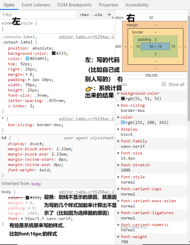 开发者工具的样式部分:左边是自己写的样式,下面有系统原来写的比如下面的font:16px;的样式;右边是计算出来的样式。