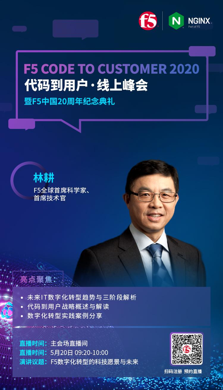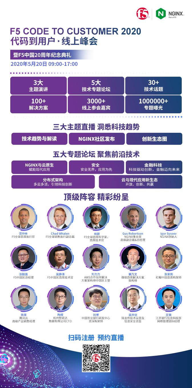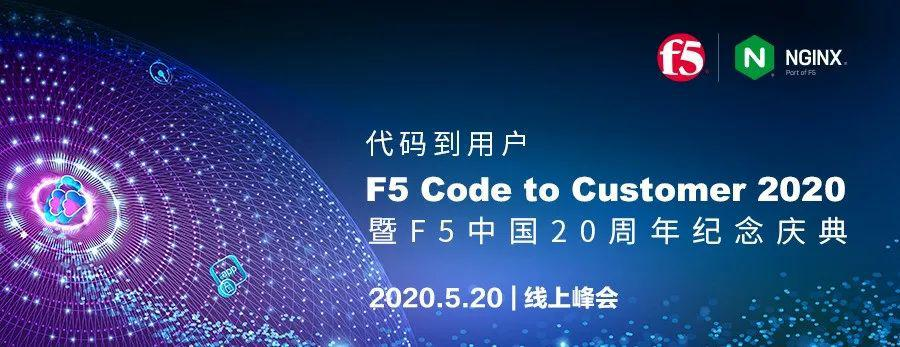 2020年5月20日,F5“代码到用户”线上峰会,暨F5中国20周年纪念庆典将正式拉开帷幕。