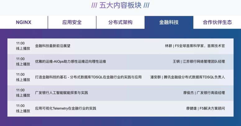 同时,金融科技板块也有更多精彩内容和技术干货将于5月20日上午11点同步开放。F5“代码到用户”线上峰会详情:搜索“F5社区”网站或者关注F5Networks公众号。