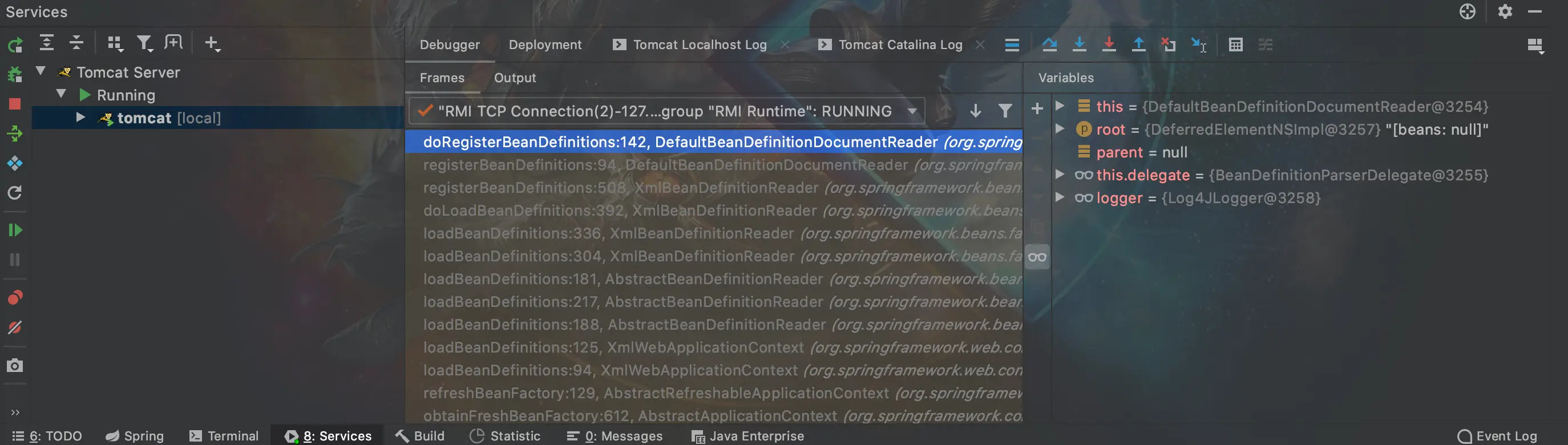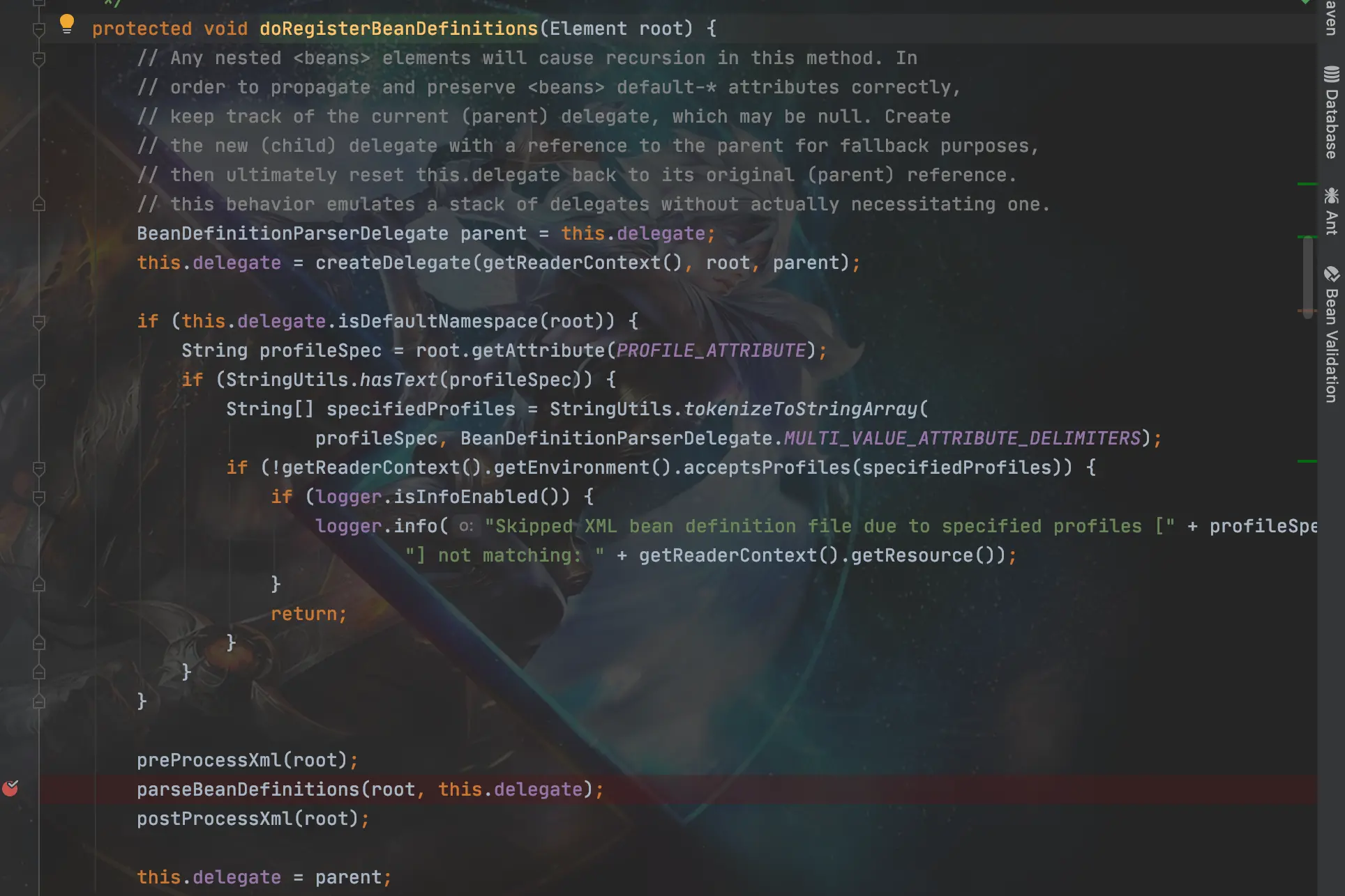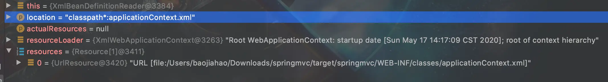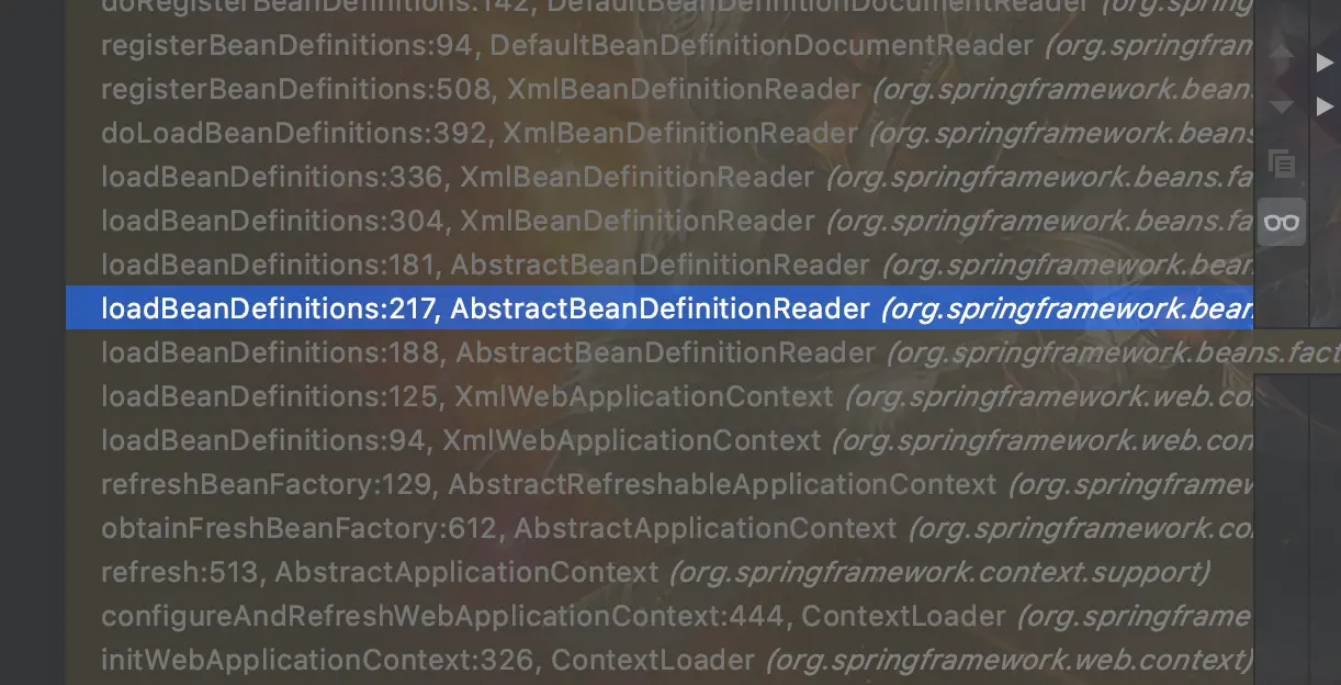 虽然大致流程知道了但还是不知道从哪开始,我们现在DefaultBeanDifinitionDocumentReader类的doRegistryBeanDefinition(Element root)方法中打个断点,然后debug启动我们的SpringMvc项目。