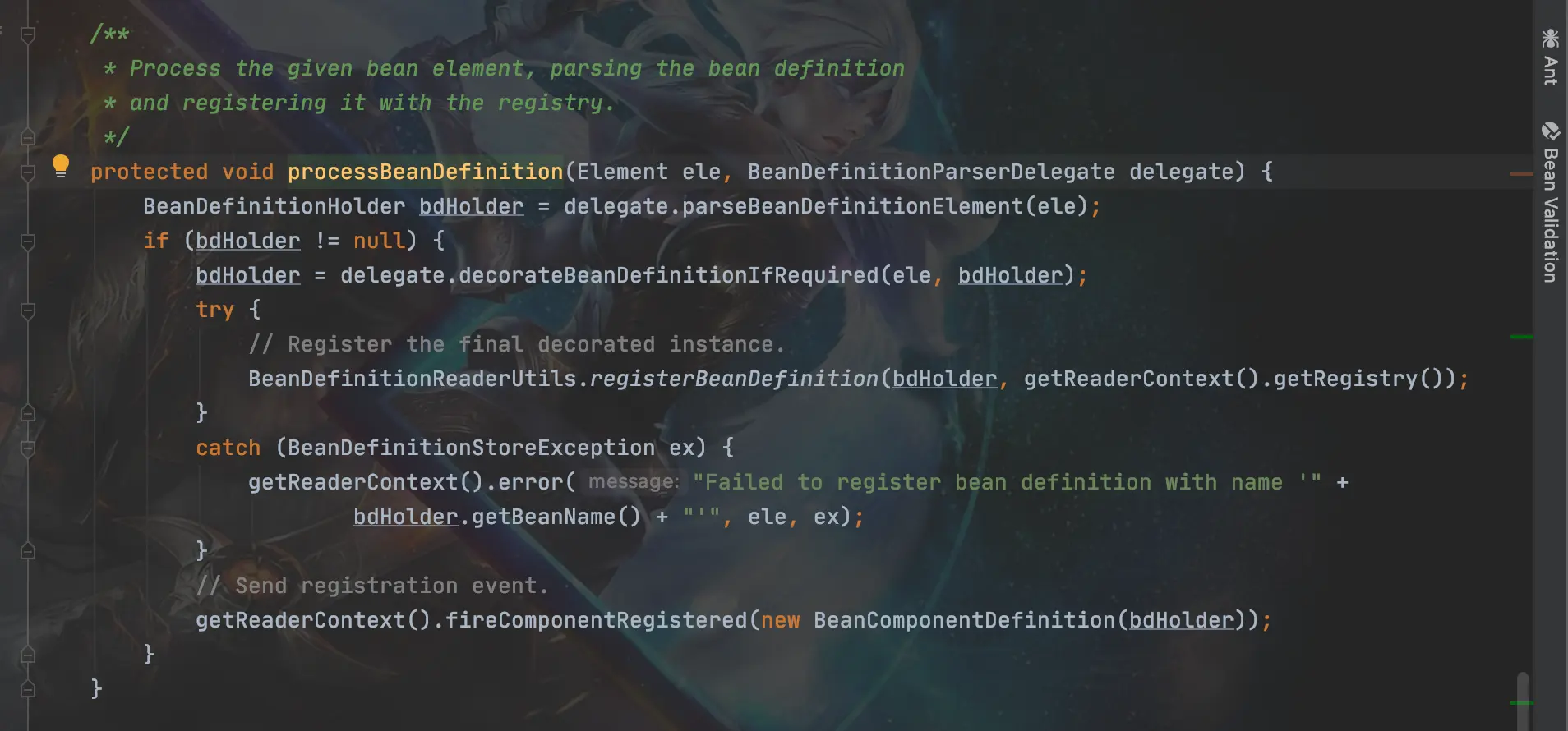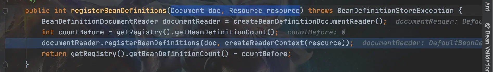 2:BeanDefinitionReader:它的作用主要是为了加载Bean,然后将spring.xml转换成Document文档,它有三个实现,我们最常规的就是XmlBeanDefinitionReader,因为我们使用的是xml配置的。其余还有二个实现PropertiesBeanDefinitionReader和GroovyBeanDefinitionReader二个实现类。这二个有兴趣可以自己去了解下。 在XmlBeanDefinitionReader类中的loadBeanDefinitions(EncodedResource encodedResource)方法,它的作用是通过之前获得到的文件Resource获取该文件的文件流,并设置编码,然后封装到一个InputSource对象中。 3:BeanDefinitionDocumentReader:该接口作用有二个,第一:解析Document文件。2:将xml配置的Bean属性保存到BeanDefinition中,然后保存到BeanDefinitionHolder中。看看源码的实现,在XmlBeanDefinitionReader类的registerBeanDefinition(Document doc, Resource resource);方法