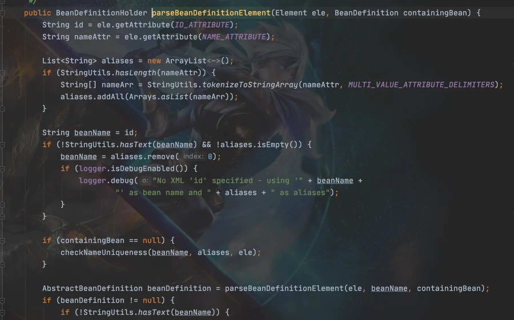 返回的beanDefinitionHolder对象之后通过BeanDefinitionRegistry的registerBeanDefinition()方法注册,具体实现是在DefaultListAbleBeanFactory类的registerBeanDefinition方法中,具体就是保存在一个beanDefinitionMap的Map中。至此依赖配置文件的容器初始化就到这里了。