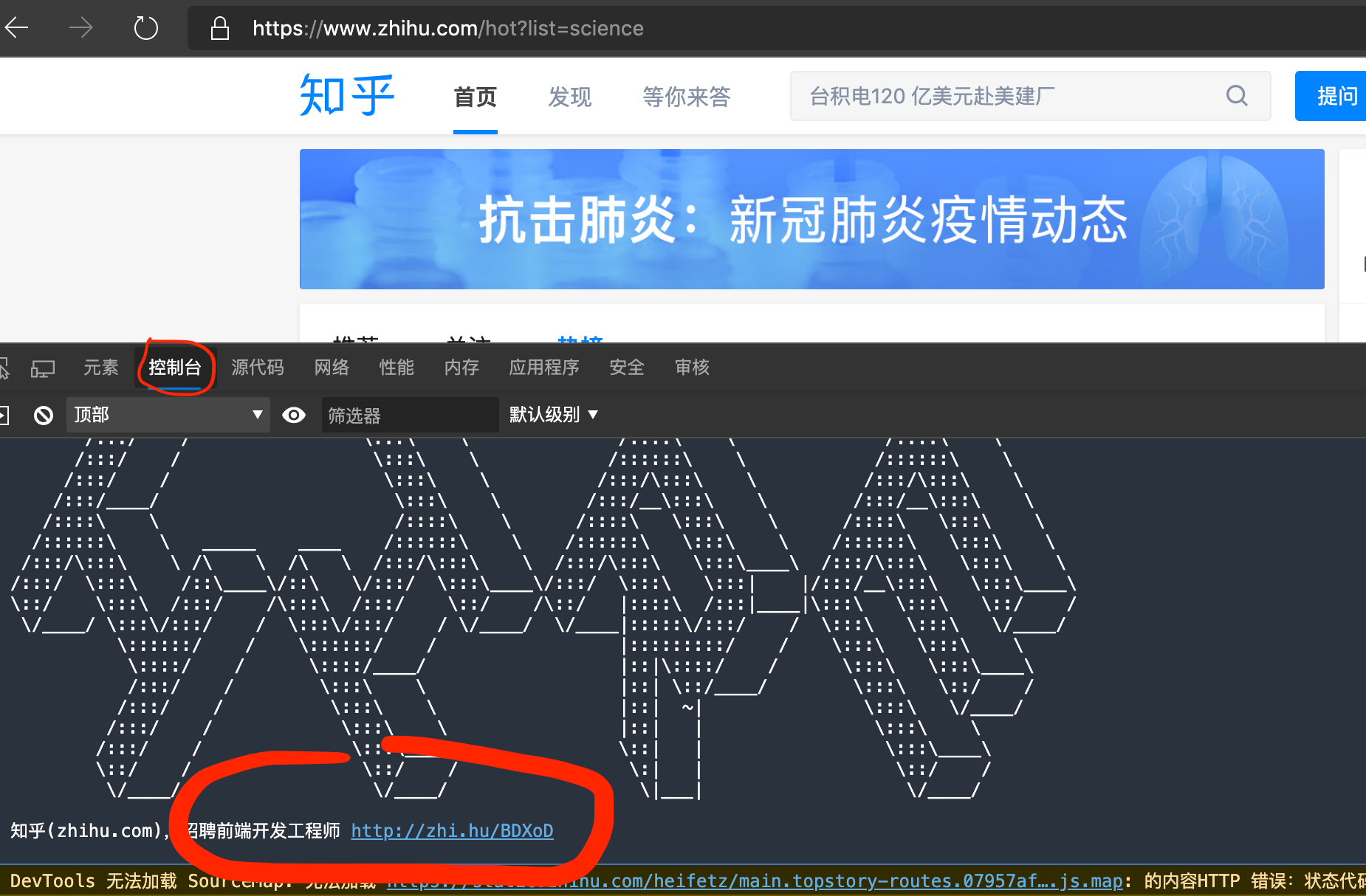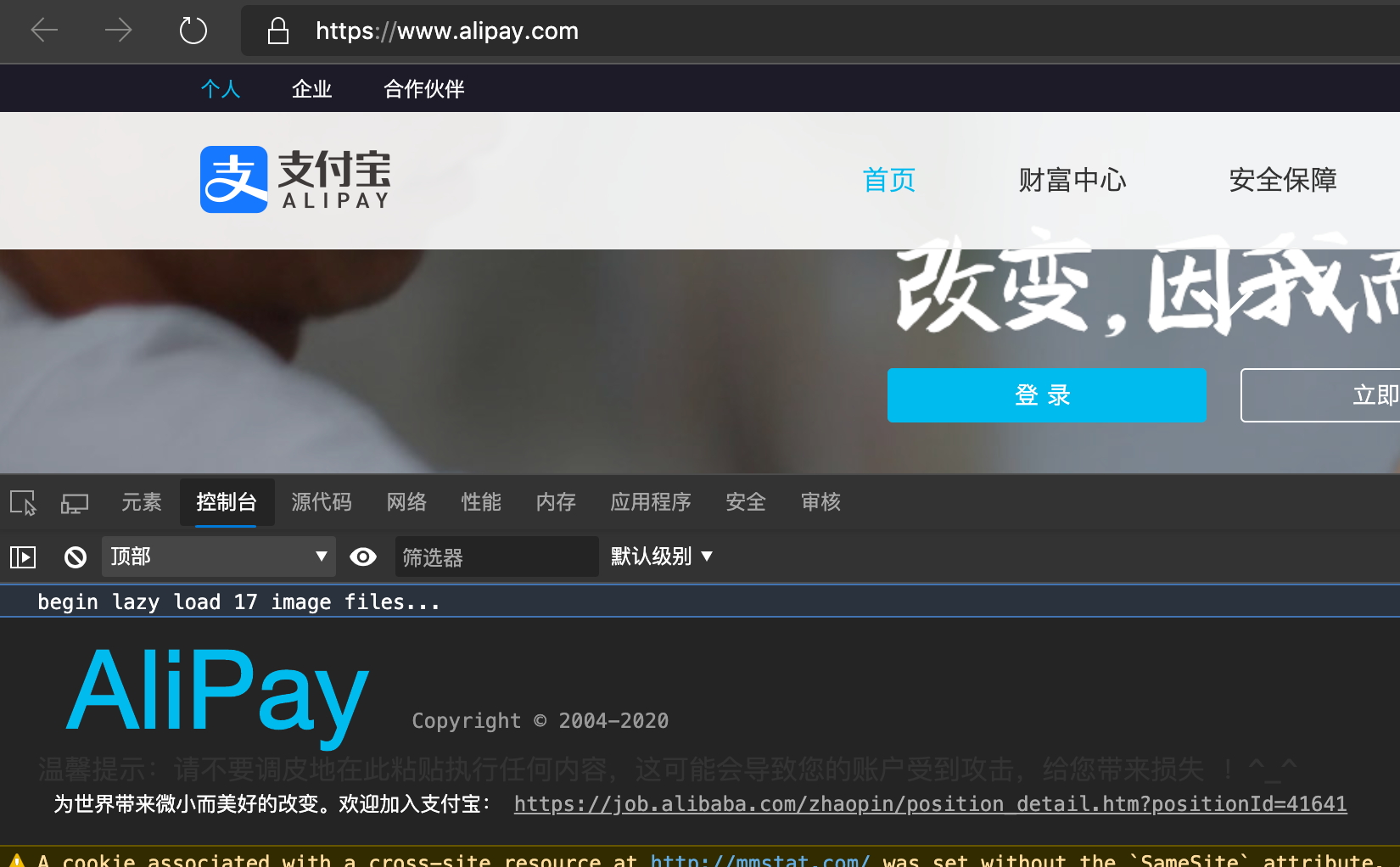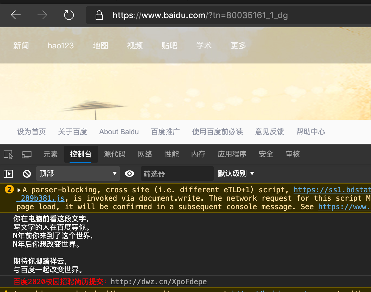 一些大厂经常会在自己的官网的console(控制台)界面输出招聘的信息,因为console界面的信息一般人是不会看的,只有一些专门学IT专业的同学才会打开,所以看到这里的信息的同学基本上都是有一定基础,同时有兴趣钻研网站构成的(或者其他原因),我也是之前看一些网站的页面代码组成结构的时候发现的。
