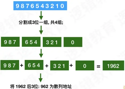 将关键字从左到右分割成位数相等的几部分(最后一部分的位数可以不同),然后取这几部分的叠加和,并按散列表的表长,取最后几位作为散列地址。