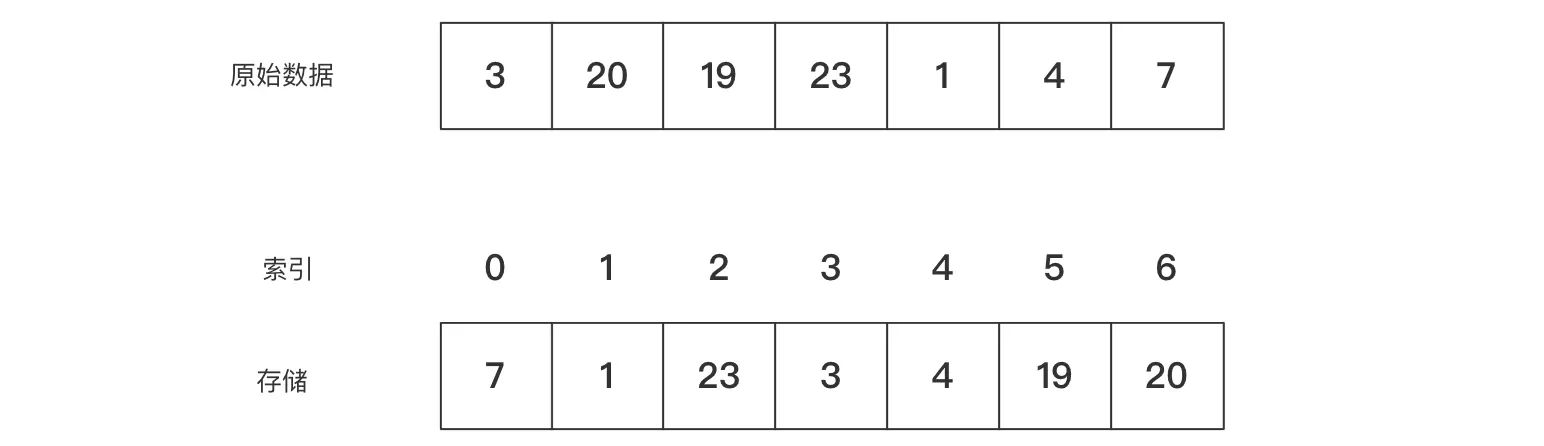 7,令p=7,对各个原始数据进行取余操作,最终得到新的存储方式。