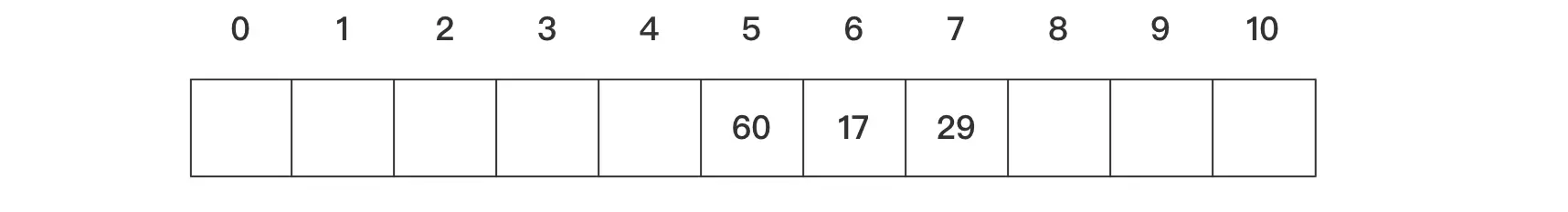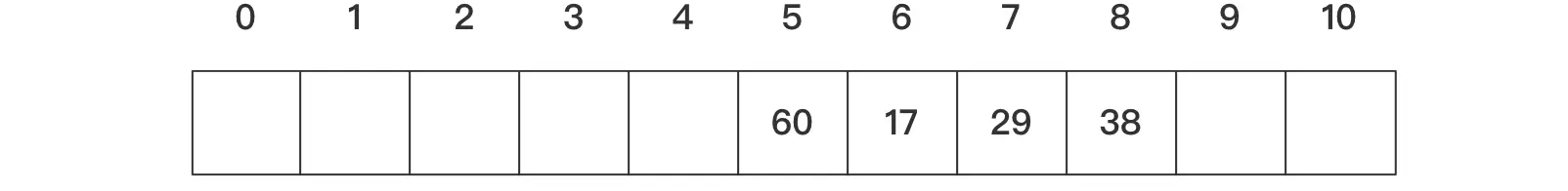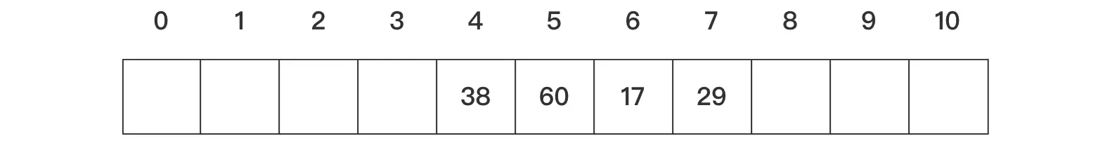 例如长度为11的哈希表中已经填好17、60、29这三个数据。对应的哈希函数为f(key)=key Mod 11,现在第4个数据为38,通过哈希函数求得的哈希地址为5,与60冲突,我们可以通过以下几种方法来分析对应的解决方案。