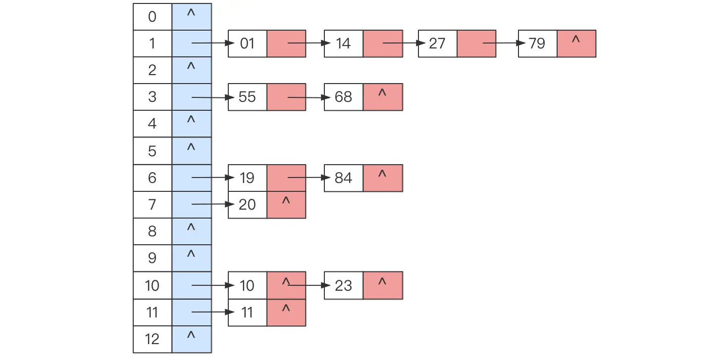 例如有一组关键字为{19,14,23,01,68,20,84,27,55,11,10,79},其哈希函数为f(key)=key%13,使用链地址法构建的哈希表如下图所示: