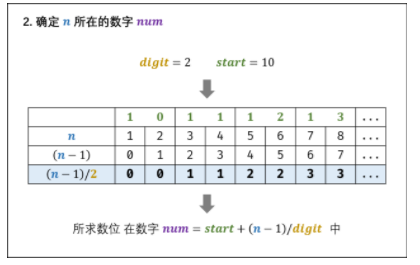 所求数位从数字start开始的第[(n-1)/digit]个数字中,因为有个0. num = start + (n-1)/digit;