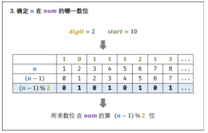 所求数位为数字num的第(n-1)%digit位,数字的首个数位为第0位。 s=str(num); res = int(s[(n-1)%digit]);代表num的 第 (n - 1) % digit 个数位,并转化为 int