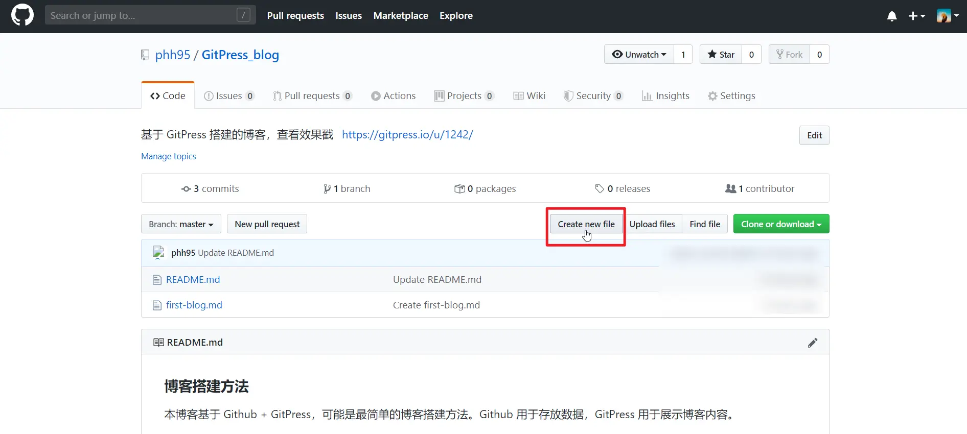 当你想发布博客时,需要回到 GitHub 仓库,点击「Create new file」创建一份新的文档。