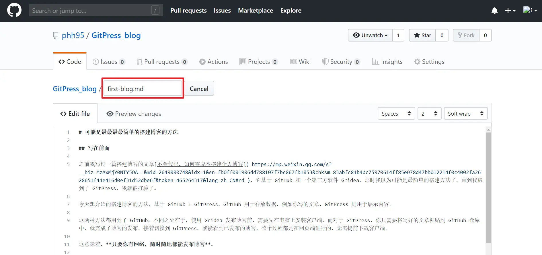 编辑好文章后,滑动到页面底部,点击「Commit changes」,就完成了博客的发布。