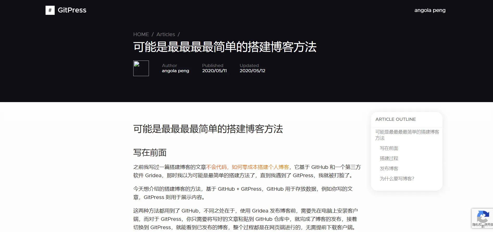 之前我写过一篇搭建博客的文章不会代码,如何零成本搭建个人博客,它基于 GitHub 和一个第三方软件 Gridea,那时我以为可能是最简单的搭建方法了,直到我遇到了 GitPress,我就被打脸了。