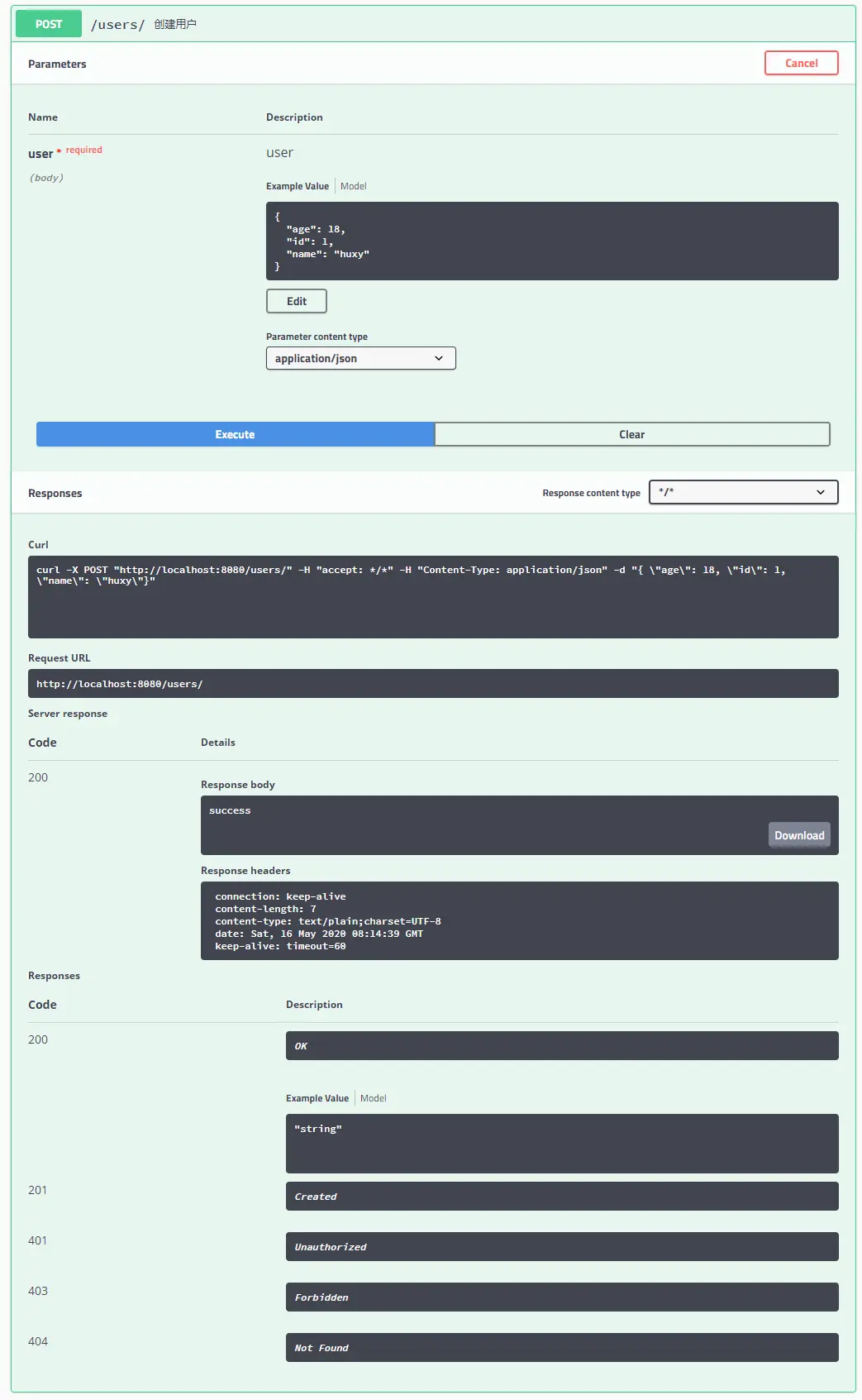 同时 Swagger 除了接口文档功能外,还提供了接口调试功能,以创建用户接口为例,单击创建用户接口,可以看到接口定义的参数、返回值、响应码等,单击 Try it out 按钮,然后点击 Execute 就可以发起调用请求、创建用户,如下图所示: