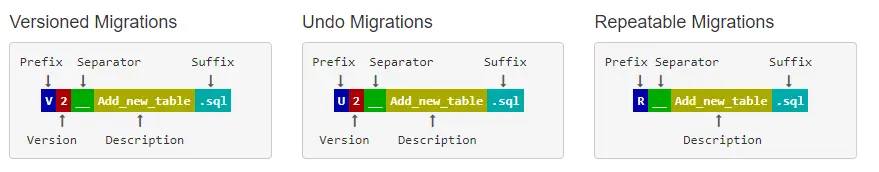 - Prefix 前缀:V 代表版本迁移,U 代表撤销迁移,R 代表可重复迁移
