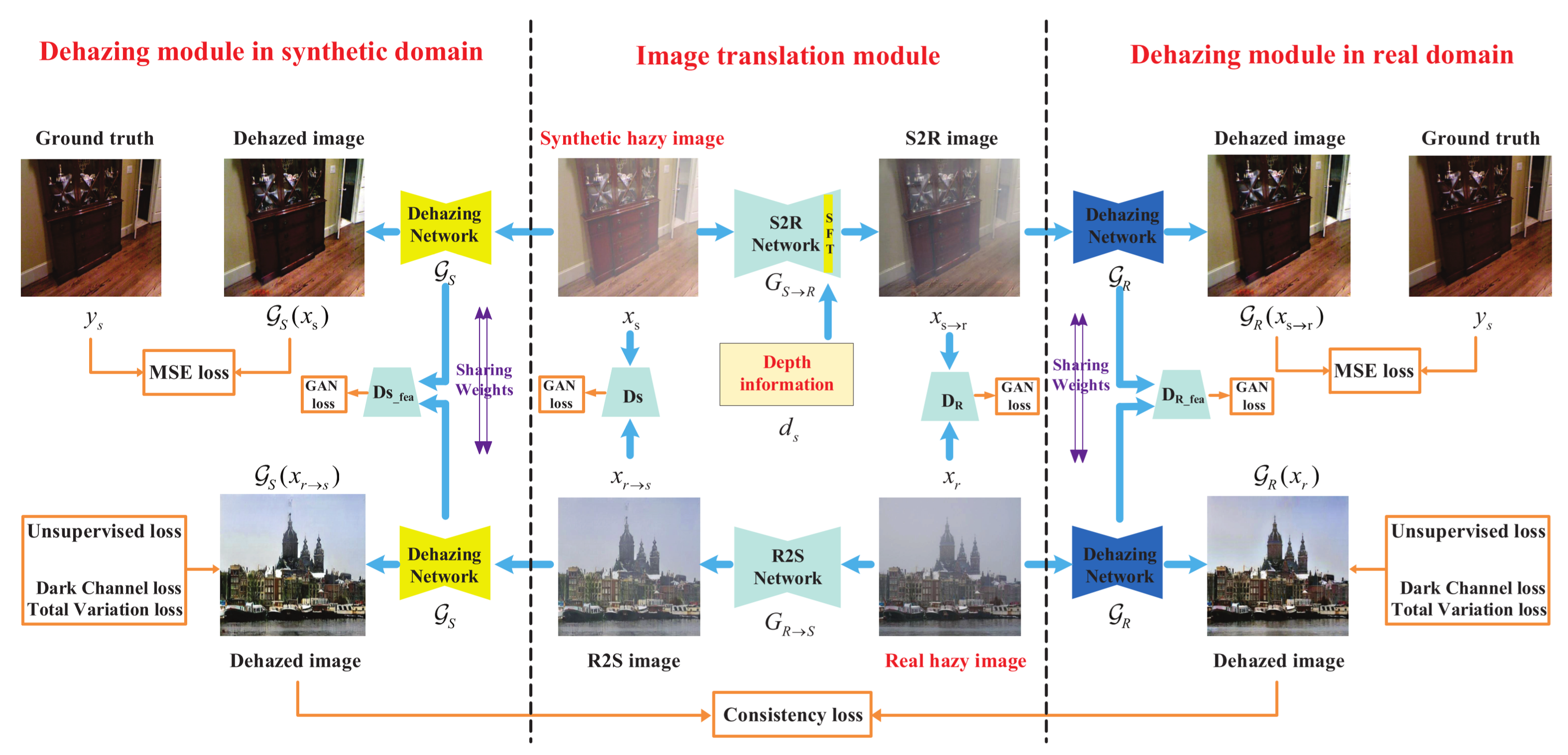网络分为三块,一个图像转换模块(Image translation module)和两个去雾模块(Dehazing module in synthetic/real domain)组成。