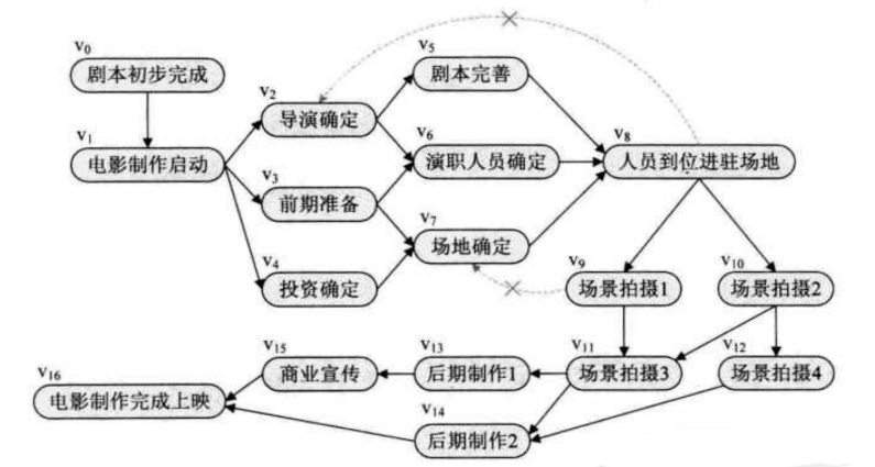 从中可以得知, 某些流程是有条件的, 必须等到前面的工程完成才能继续这个流程. 在一个表示工程的有向图中,用顶点表示活动,用弧表示活动之间的优先关系, 这样的有向图为顶点表示活动的网,我们称之为AOV网(Action On VertexNetwork).