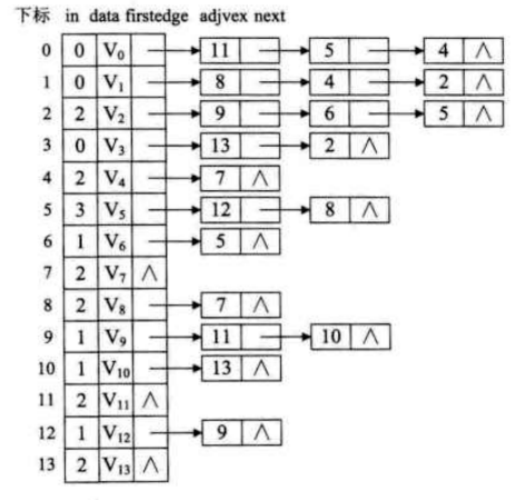因为在拓扑排序中需要删除节点, 所以使用邻接表会比较方便一些. 所以为AOV网建立一个邻接表. 并且要为它添加一个入度: