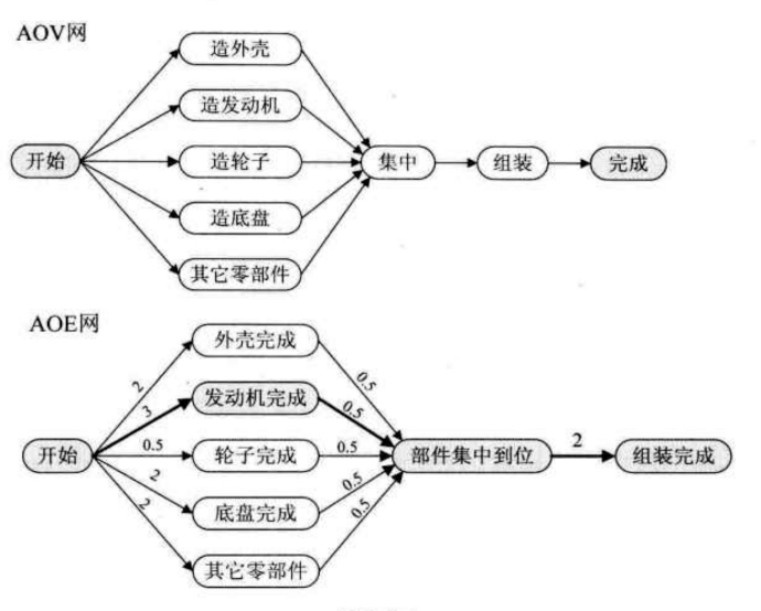 之前是在AOV网的基础上, 这里就是在AOV的基础上增加了权值. 在一个表示工程的带权有向图中, 用顶点表示事件, 用有向边表示活动, 用边上的权值表示活动的持续时间, 这种有向图的边表示活动的网, 称之为AOE网.