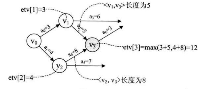 - 事件的最早发生时间etv: 即顶点Vk的最早发生时间